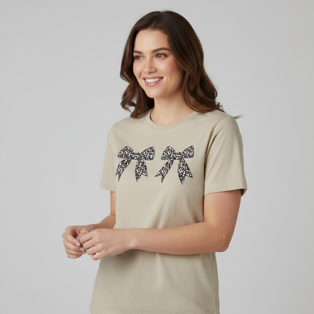 A T-Shirt Laço Animal Print traz delicadeza e estilo em um design moderno com detalhe de laço, perfeito para quem busca uma peça feminina, charmosa e cheia de personalidade. A cor caqui adiciona sofisticação e versatilidade ao look.