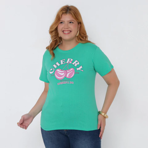 Delicada e divertida, a T-Shirt Plus Size Cherry traz uma estampa charmosa com cerejas, perfeita para quem gosta de transmitir leveza, feminilidade e estilo em suas produções. Ideal para looks casuais e combinações modernas.